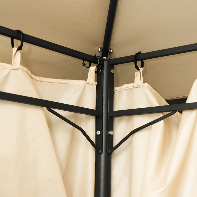 Δημιουργήστε έναν ιδανικό χώρο χαλάρωσης στον κήπο ή τη βεράντα σας με αυτό το κομψό κιόσκι. Το ανθεκτικό μεταλλικό πλαίσιο και ο μπεζ τένταρο σας προστατεύουν από τον ήλιο, ενώ οι πρακτικές κουρτίνες προσφέρουν επιπλέον σκιά και ιδιωτικότητα. Είναι η τέλεια προσθήκη για να απολαύσετε τα καλοκαιρινά σας βράδια ή τις ηλιόλουστες μέρες, μόνοι ή με παρέα.
