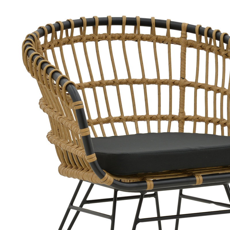 - Κυρίως επιφάνεια καρέκλας από PE rattan σε φυσικό χρώμα. Το PE rattan είναι ένα είδος οικολογικού συνθετικού rattan, ανακυκλώσιμο και με μεγαλύτερη ανθεκτικότητα σε σχέση με τα άλλα είδη.