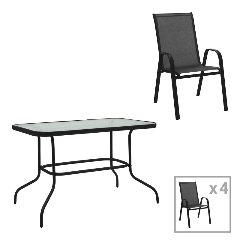 Τραπεζαρία Valor-Obbi pakoworld σετ 5τεμ μέταλλο μαύρο-γυαλί-pe γκρι 110x60x70εκ
