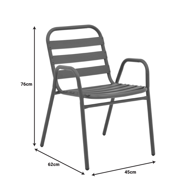 - Σταθερός σκελετός από μέταλλο εξαιρετικής ποιότητας με αντοχή σε φθορά και χρόνο, ενώ τα κομμάτια έδρας και πλάτης είναι κατασκευασμένα από φέτες αλουμινίου. Το μέταλλο παρέχει ανθεκτικότητα και σταθερότητα, ενώ οι φέτες αλουμινίου προσθέτουν ελαφρότητα και μια μοντέρνα αίσθηση στον σχεδιασμό. Η καρέκλα αυτή είναι ιδανική για χρήση σε εξωτερικούς χώρους, καθώς η ανθεκτικότητα στις καιρικές συνθήκες του αλουμινίου την καθιστά ανθεκτική σε έκθεση στον ήλιο και την υγρασία.