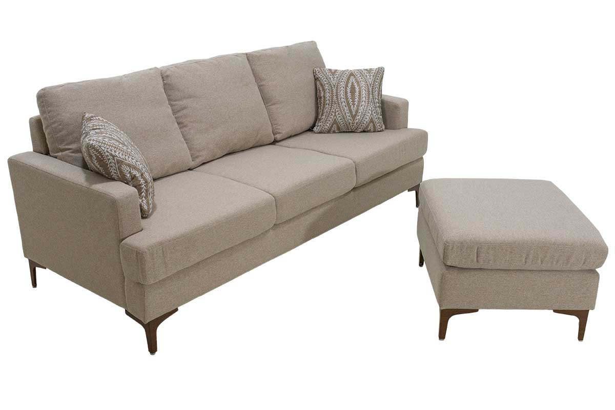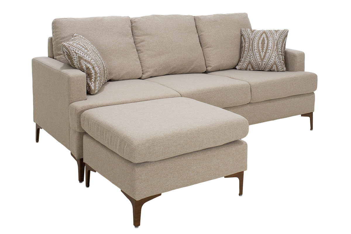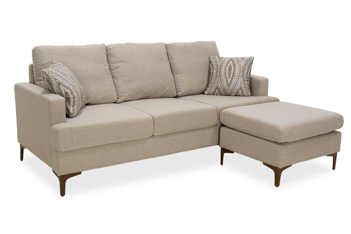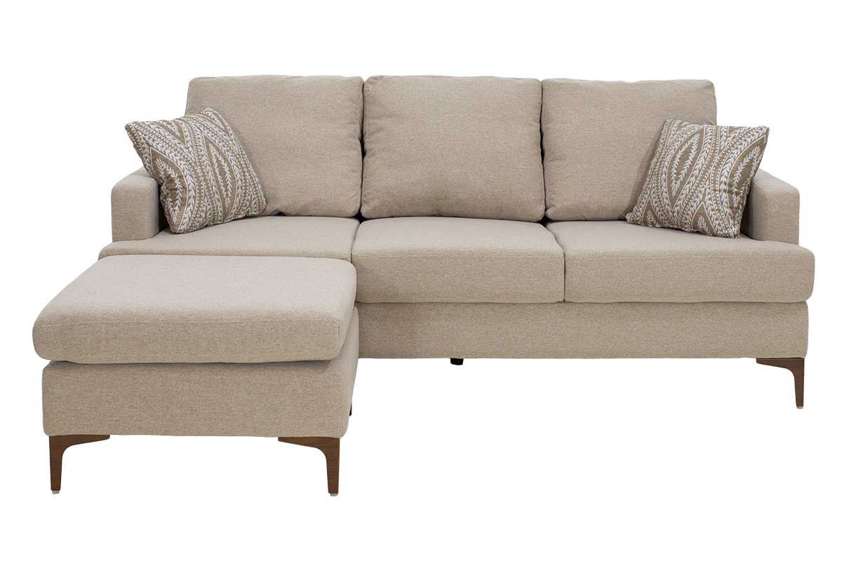 Γωνιακός καναπές Slim με σκαμπό υφασμάτινος χρώμα μπεζ με μαξιλάρια