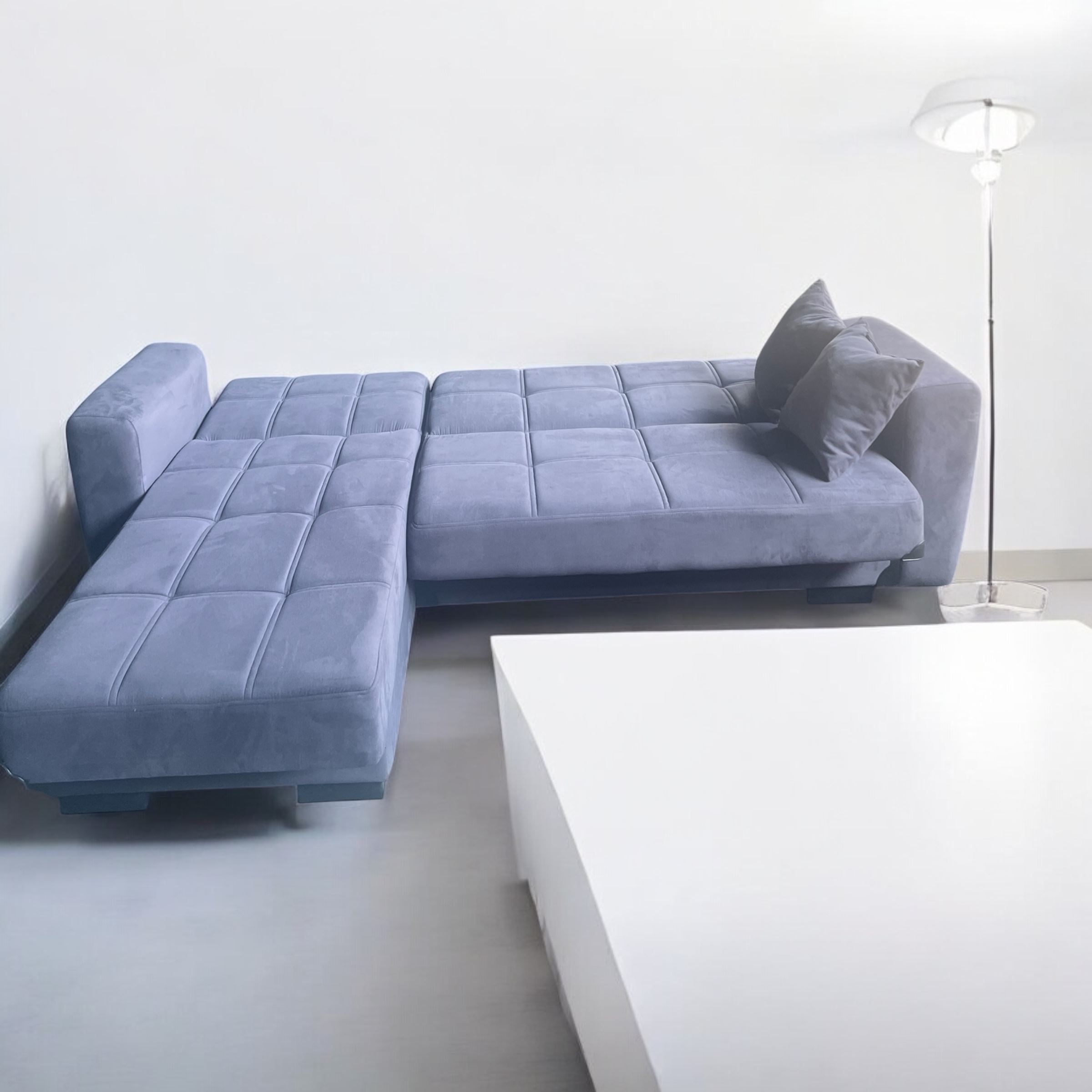 Ο γωνιακός καναπές με δεξιά φορά γωνίας. Ο σχεδιασμός του καναπέ δίνει τη δυνατότητα μετατροπής του σε κρεβάτι, ενώ διαθέτει και αποθηκευτικό χώρο για την οργάνωση και αποθήκευση κλινοσκεπασμάτων και άλλων αντικειμένων. Για τη φροντίδα ενός υφασμάτινου καναπέ, προτείνεται η χρήση ηλεκτρικής σκούπας με το ειδικό εξάρτημα για έπιπλα.