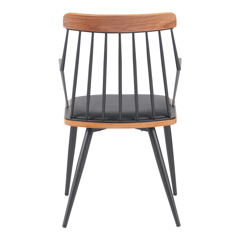 Η πολυθρόνα τραπεζαρίας Posse διακρίνεται για τον εκλεπτυσμένο βιομηχανικό της σχεδιασμό. Διαθέτει ένα άνετο, λεπτό μαξιλάρι καθίσματος , το οποίο πλαισιώνεται από έναν κομψό μεταλλικό σκελετό. Η πλάτη αποτελείται από κάθετες μεταλλικές ράβδους που καταλήγουν σε μια οριζόντια, ξύλινη λεπτομέρεια, προσδίδοντας μια διακριτική αντίθεση. Τα λεπτά, κωνικά μεταλλικά πόδια ενισχύουν την αίσθηση ελαφρότητας και σταθερότητας. Οι καμπύλες μεταλλικές χειρολαβές προσφέρουν επιπλέον άνεση και στυλ.