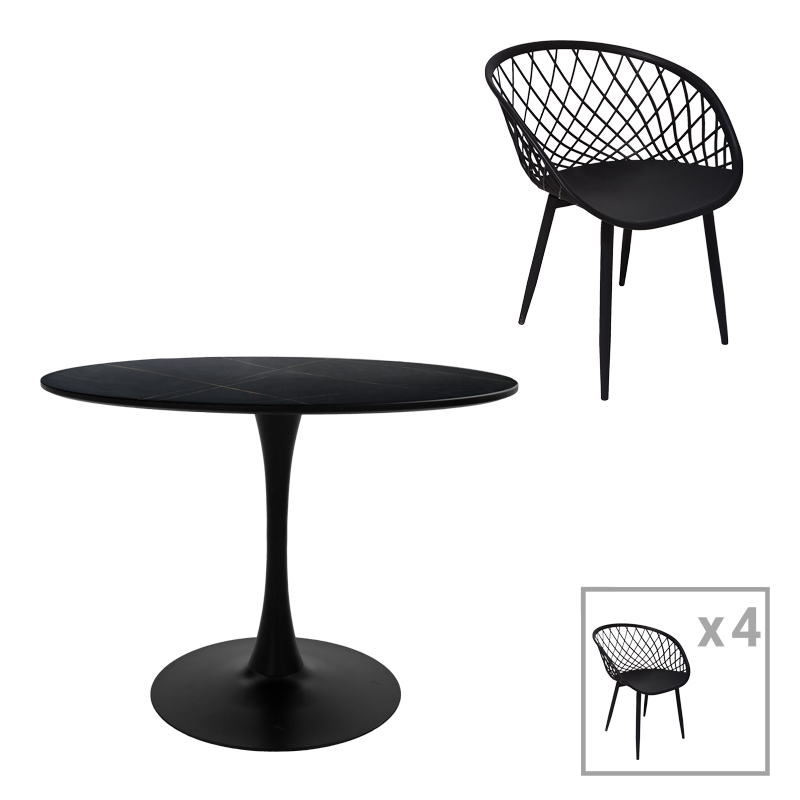 Ενα μοναδικό σετ τραπεζαρίας που συνδυάζει την άνεση με το design και τη ποιότητα με τη λειτουργικότητα. Κατασκευασμένη απο υλικά υψηλής ποιότητας την καθιστά ένα διαχρονικό έπιπλο. Το μαύρο χρώμα προσδίδει έναν αέρα σοφιστικέ, ενώ τα ξύλινα πόδια δημιουργούν μια ζεστή αντίθεση.