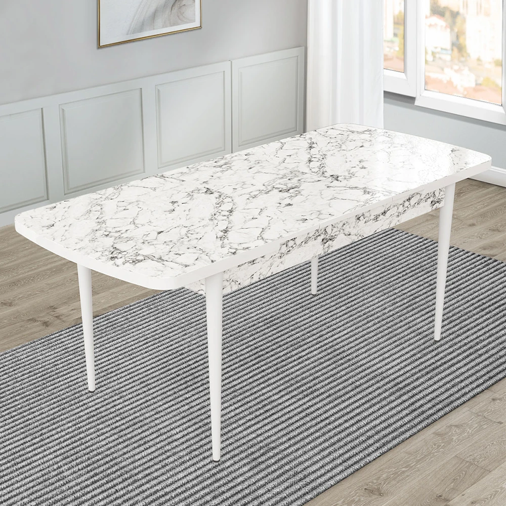 Η επιφάνεια σε απόχρωση White Marble χαρίζει αίσθηση πολυτέλειας και φωτεινότητας στον χώρο, ενώ συνδυάζεται εύκολα με μοντέρνα αλλά και minimal διακόσμηση. Η στιβαρή κατασκευή εξασφαλίζει σταθερότητα και αντοχή, καθιστώντας το τραπέζι ιδανικό για καθημερινή χρήση.