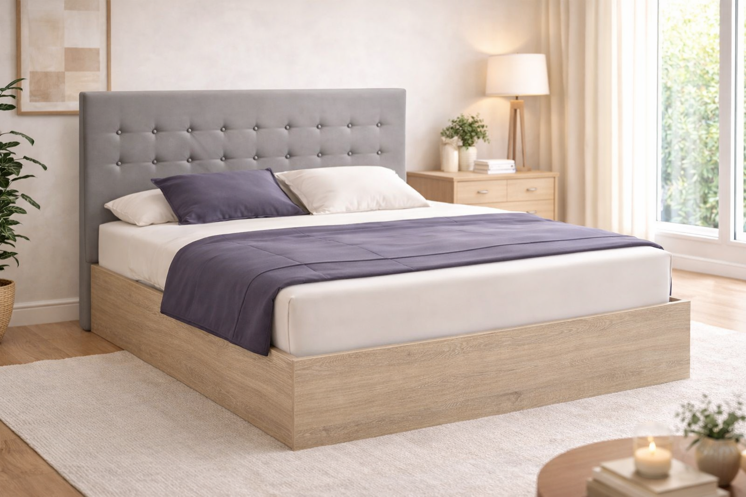 Το διπλό κρεβάτι Calma συνδυάζει τη φυσική ομορφιά του ξύλου με έναν σύγχρονο, minimal σχεδιασμό που ταιριάζει σε κάθε υπνοδωμάτιο. Η σταθερή ξύλινη βάση σε φυσική απόχρωση προσφέρει αντοχή και διαχρονικό στυλ, ενώ το επενδυμένο υφασμάτινο κεφαλάρι σε ουδέτερο γκρι τόνο χαρίζει άνεση και κομψότητα.Ιδανικό για στρώμα διαστάσεων 160×200 εκ., το κρεβάτι προσφέρει άνετο χώρο ύπνου και αρμονική αισθητική. Ο καθαρός σχεδιασμός του το καθιστά εύκολο να συνδυαστεί με διαφορετικά στυλ διακόσμησης, από μοντέρνο έως σκανδιναβικό. Είναι κατασκευασμένο από μοριοσανίδα (νοβοπάν), ένα παράγωγο ξύλου από μικρά κομμάτια ξύλου και πριονίδι.