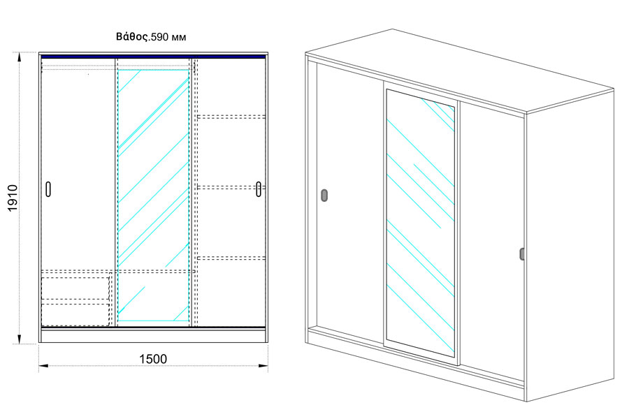 Η Ντουλάπα 1211006 είναι τριών φύλλων με συρόμενη πόρτα και χωρίζεται σε δύο μέρη με μεσαίο διαχωριστικό. Το ένα μέρος έχει μοχλό σχεδιασμένο για κρεμάστρες και το δεύτερο μισό αποτελείται από τρία ράφια. Στο τμήμα με το μοχλό υπάρχουν 2 εσωτερικά συρτάρια. Η μεσαία πόρτα περιλαμβάνει και καθρέφτη.
