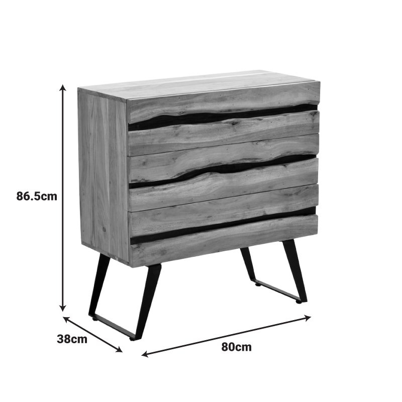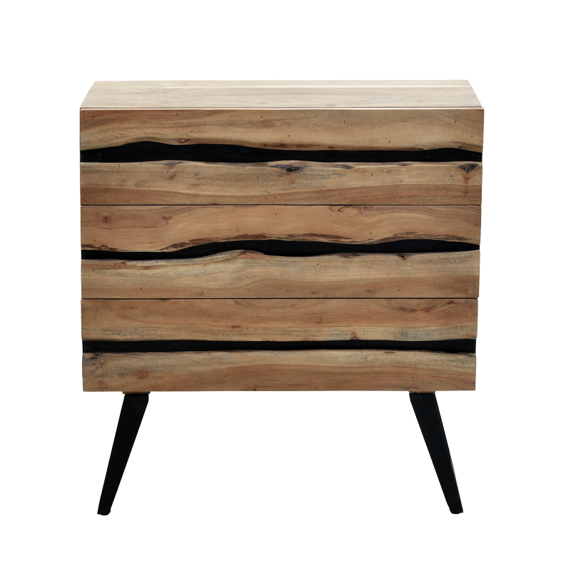 Η συρταριερα Imena I συνδυάζει αριστοτεχνικά την ακατέργαστη ομορφιά του φυσικού ξύλου με μια μοντέρνα, βιομηχανική πινελιά. Το ξεχωριστό χαρακτηριστικό του είναι η εντυπωσιακή “ρωγμή” που διατρέχει την πρόσοψή του, δημιουργώντας ένα μοναδικό οπτικό ενδιαφέρον και αναδεικνύοντας την οργανική του φύση.
