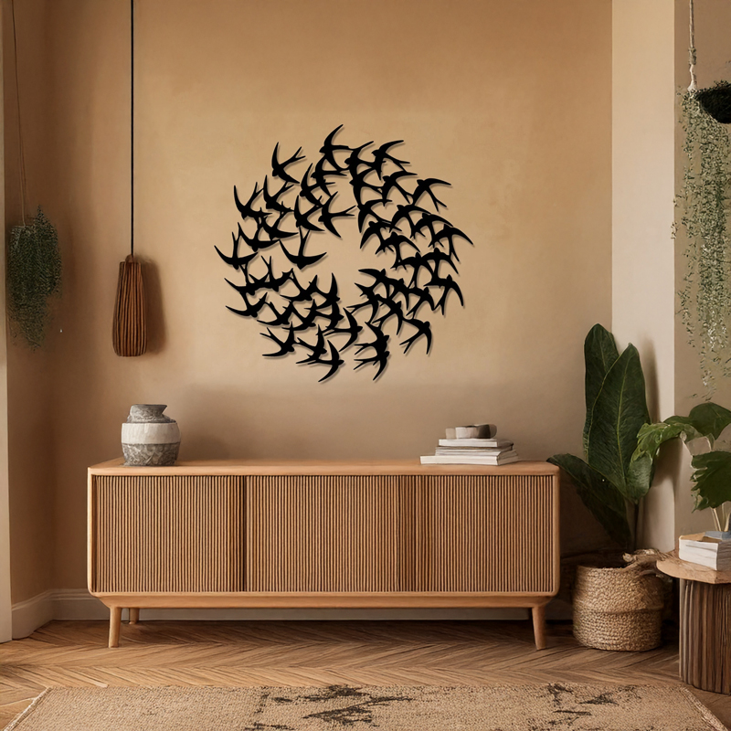 Φέρτε την κίνηση και τη ζωντάνια της φύσης μέσα στο σπίτι σας με το Swarm, ένα εντυπωσιακό διακοσμητικό που απεικονίζει ένα σμήνος χελιδονιών σε κυκλικό σχηματισμό. Αυτό το έργο τέχνης δεν είναι απλώς μια διακόσμηση, αλλά μια έκρηξη κίνησης που μεταμορφώνει κάθε άψυχο τοίχο σε ένα ζωντανό σκηνικό.