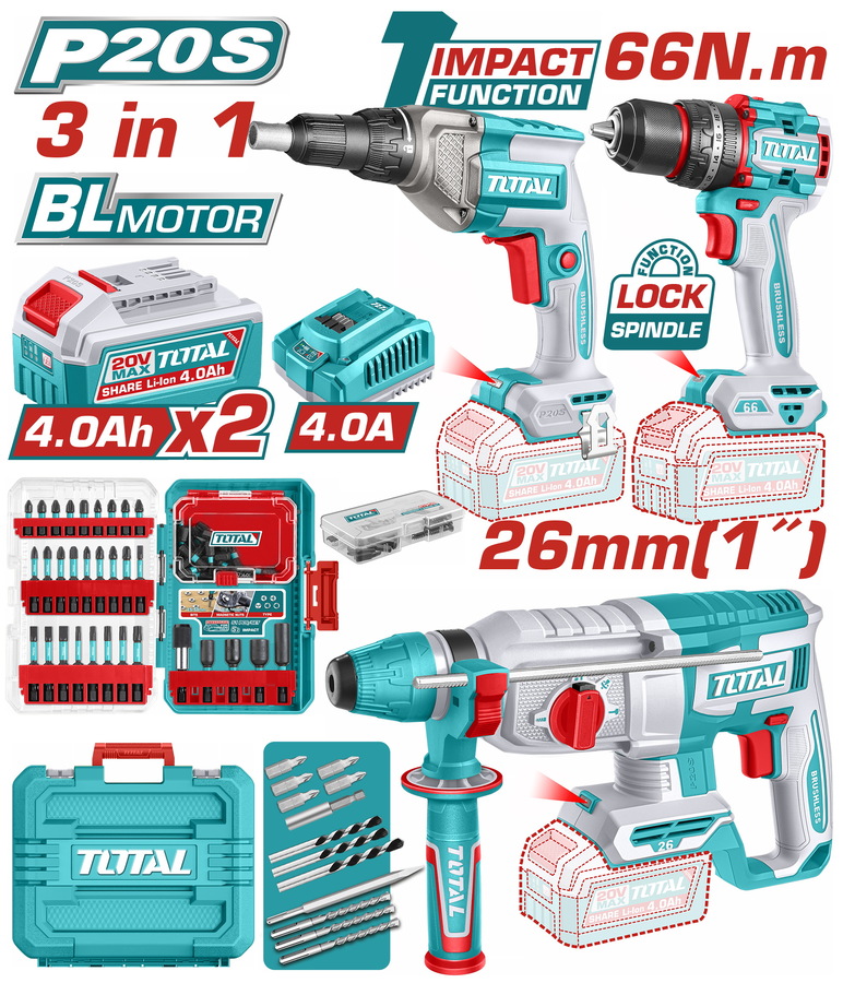 TOTAL ΕΠΑΓΓ ΣΕΤ ΔΡΑΠ/ΔΟ ΚΡΟΥΣΤ. 66Nm+ΠΝΕΥΜ ΠΙΣΤΟΛ+ΚΑΤΣΑΒ ΓΥΨ ΜΠΑΤ Li-ion 20V BL Motor (TOSLI250591E)