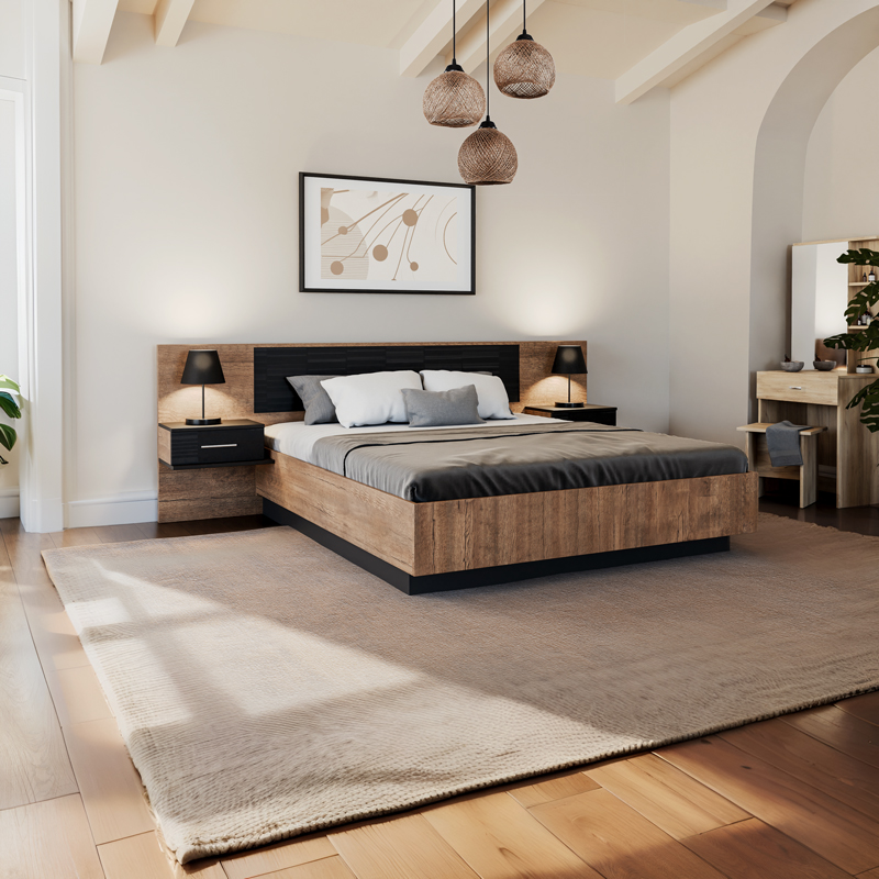 - Διαθέτει δύο κομοδίνα στις άκρες του τα οποία περιλαμβάνουν συρτάρι για κλειστή αποθήκευση των αντικειμένων της καθημερινότητας σας.