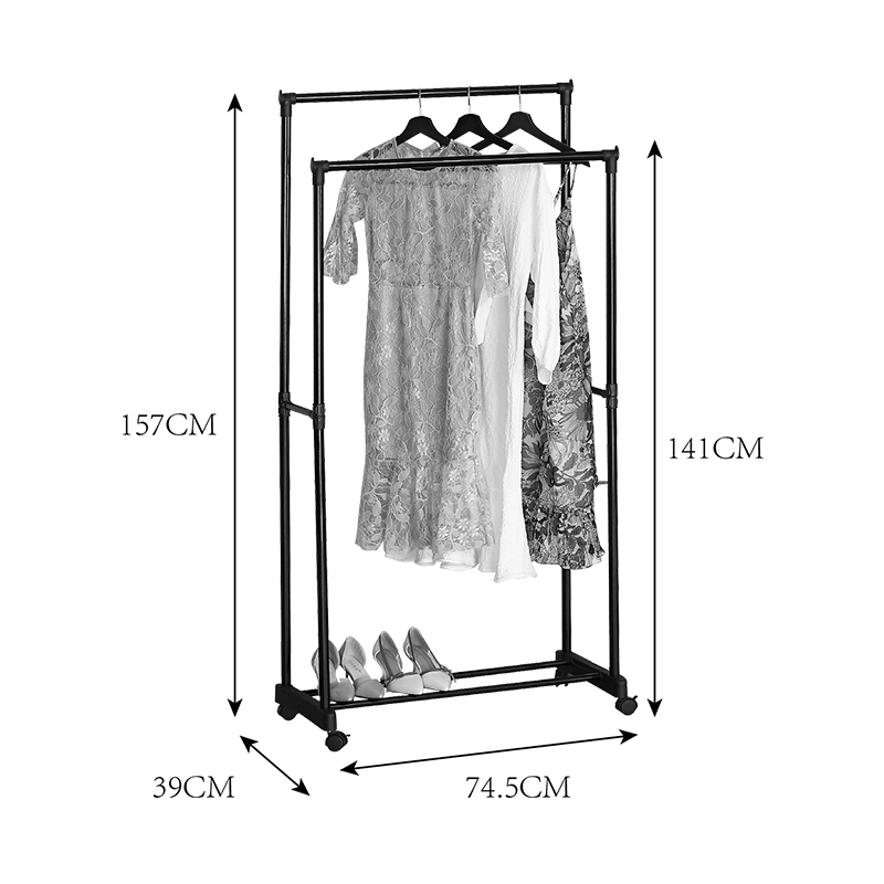 - Σχεδιασμός: Κατασκευή με διπλές μπάρες ρούχων σε ίσιο, minimal πλαίσιο. Το μαύρο ματ χρώμα του μετάλλου προσδίδει μια σύγχρονη και διακριτική industrial αισθητική.