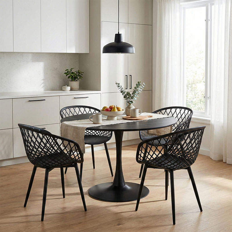 Ενα μοναδικό σετ τραπεζαρίας που συνδυάζει την άνεση με το design και τη ποιότητα με τη λειτουργικότητα. Κατασκευασμένη απο υλικά υψηλής ποιότητας την καθιστά ένα διαχρονικό έπιπλο. Το μαύρο χρώμα προσδίδει έναν αέρα σοφιστικέ, ενώ τα ξύλινα πόδια δημιουργούν μια ζεστή αντίθεση.