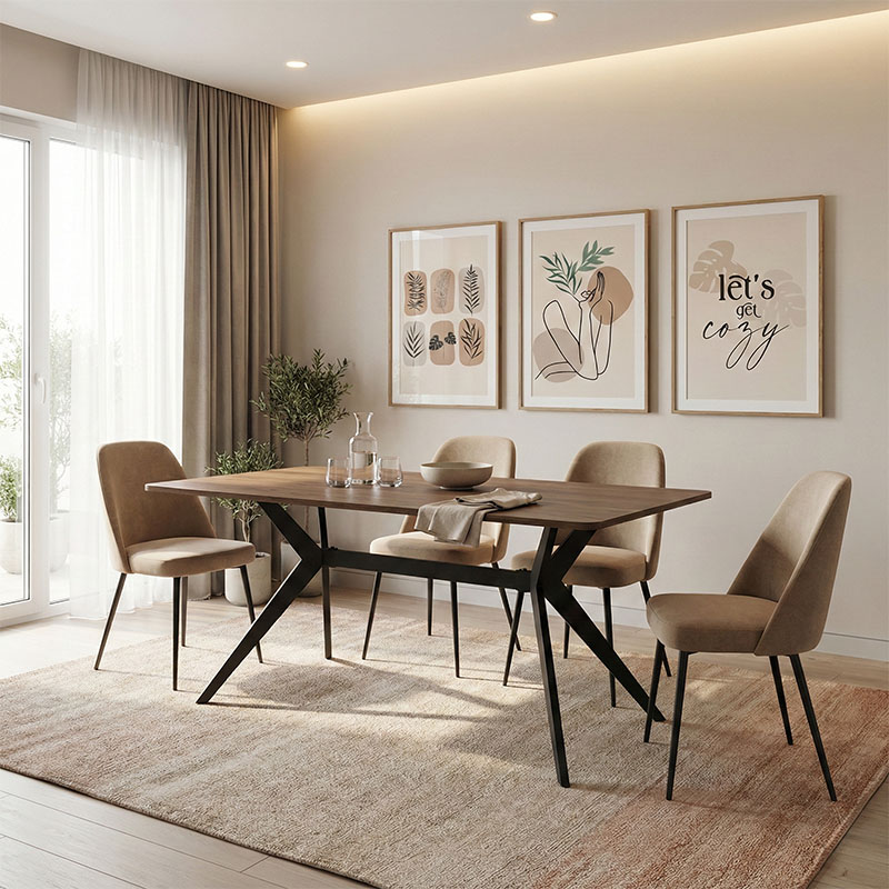 Δώστε στον χώρο σας έναν αέρα μοντέρνας κομψότητας με αυτό το εντυπωσιακό ορθογώνιο τραπέζι Ezali. Η επιφάνεια με την όψη ξύλου προσδίδει ζεστασιά και φυσικότητα, ενώ η τολμηρή, μαύρη μεταλλική βάση με τα διασταυρούμενα πόδια και την κεντρική ενίσχυση, αποτελεί ένα ξεχωριστό αρχιτεκτονικό στοιχείο που μαγνητίζει τα βλέμματα.