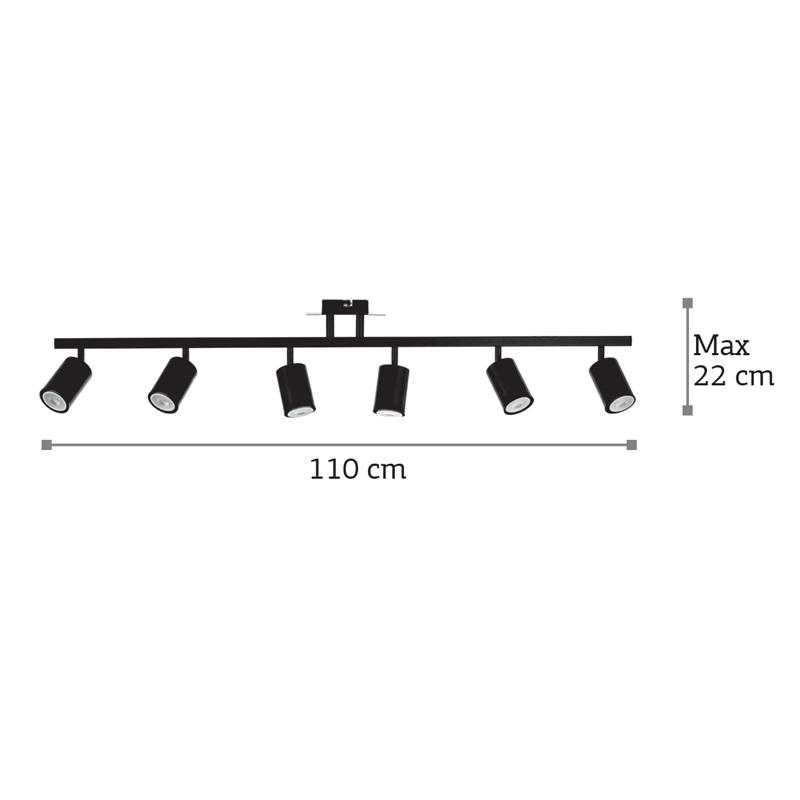 Πρόκειται για ένα μεταλλικό σποτ σε μαύρη απόχρωση με έξι λαμπτήρες. Το μεταλλικό καπάκι μπροστινό του μέρος κινείται προς οποιαδήποτε κατεύθυνση. Τοποθετείται και στην οροφή και στον τοίχο!
