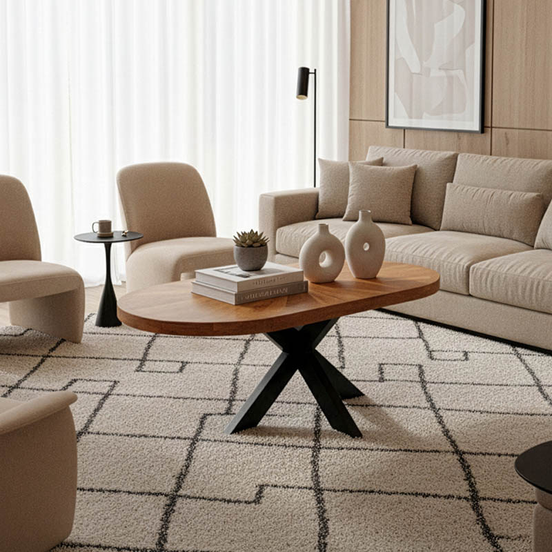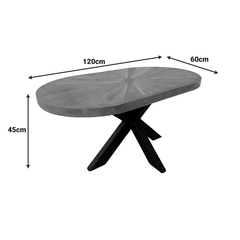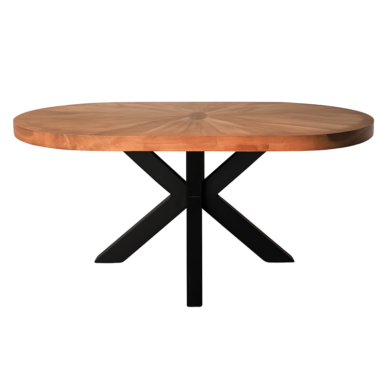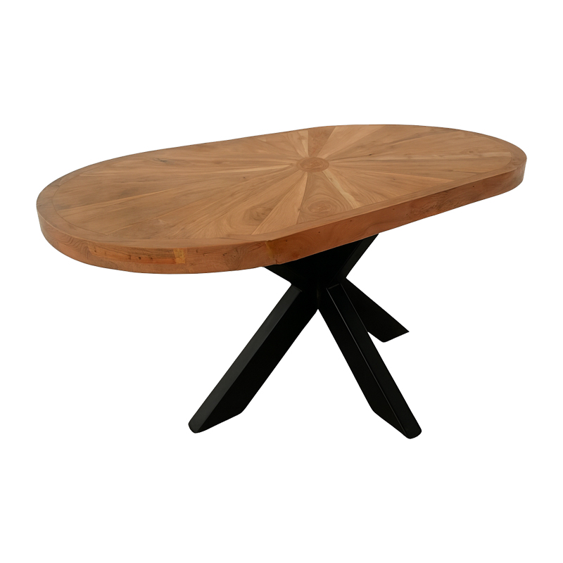 - Μοναδικός Σχεδιασμός: Η οβάλ επιφάνεια από μασίφ ξύλο, με το εντυπωσιακό ακτινωτό μοτίβο, προσδίδει μια αίσθηση ζεστασιάς και εκλεπτυσμένης ρουστίκ κομψότητας. Κάθε τραπέζι είναι μοναδικό, με τους φυσικούς κόκκους του ξύλου να αφηγούνται τη δική τους ιστορία.