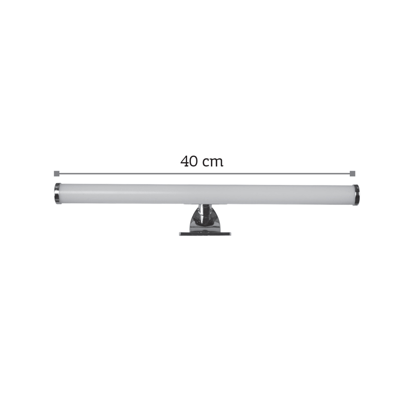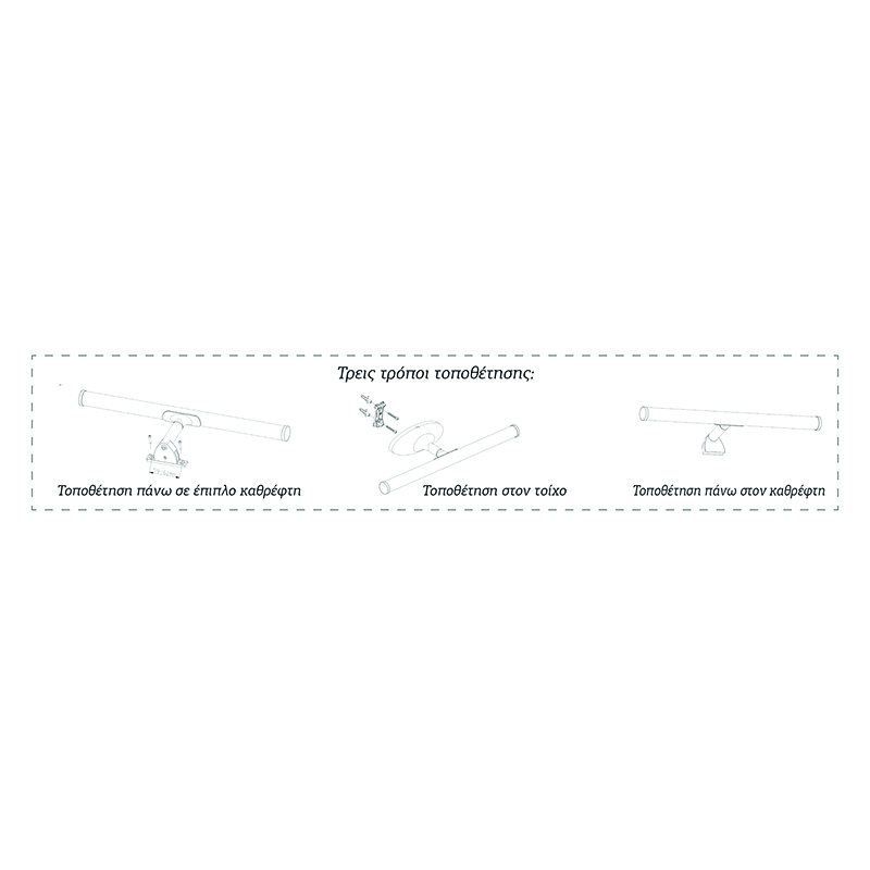 Πρόκειται για ένα επιτοίχιο φωτιστικό κατασκευασμένο από πλαστικό σε χρώμιο απόχρωση. Η λευκή του επιφάνεια καλύπτει τον led φωτισμό απόχρωσης φυσικού χρώματος. Μπορεί να τοποθετηθεί με τρεις τρόπους.