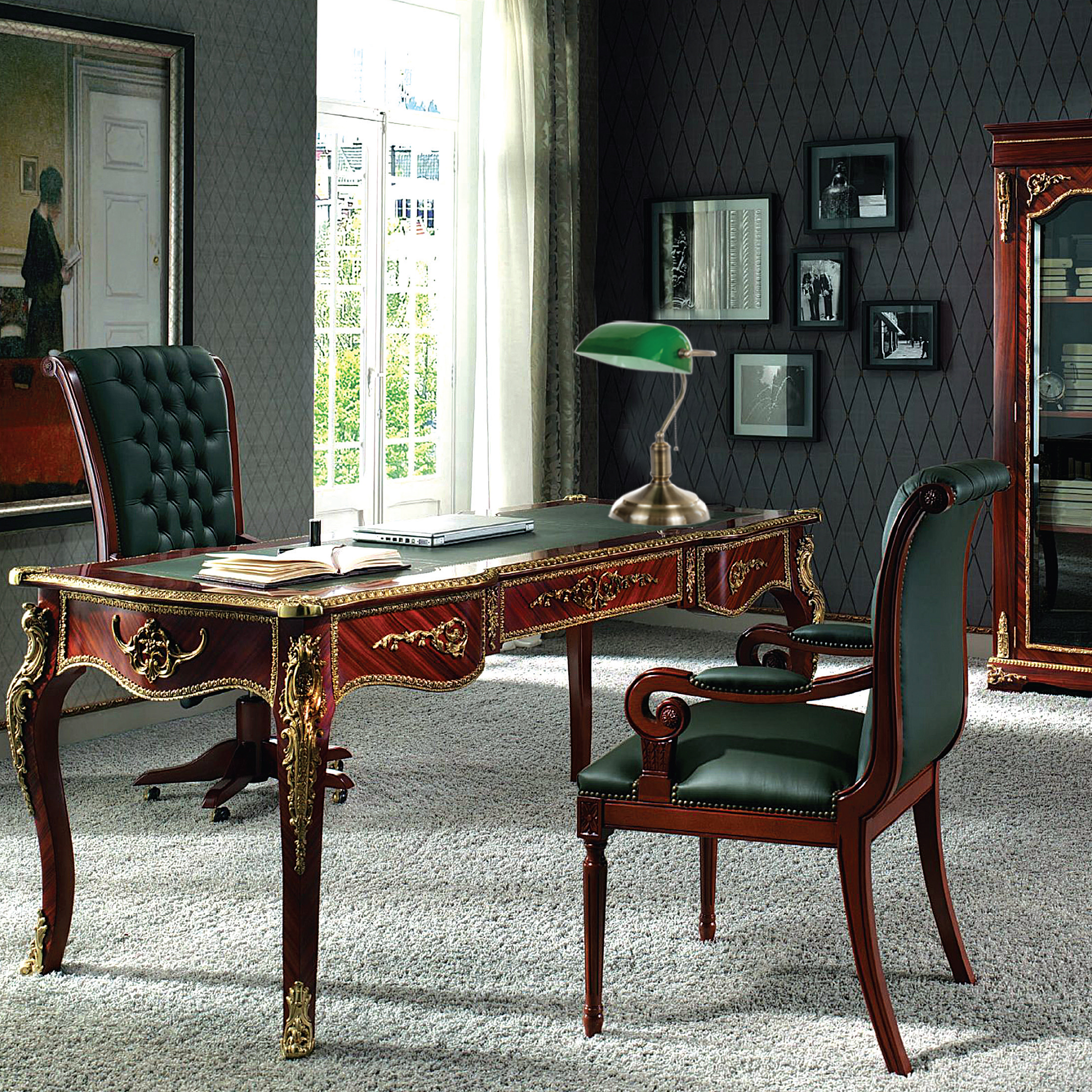 Πρόκειται για ένα οξυντέ μεταλλικό φωτιστικό συνδυασμένο με πράσινο γυαλί. Η σχεδίασή του το τοποθετεί σε κλασσικούς χώρους.