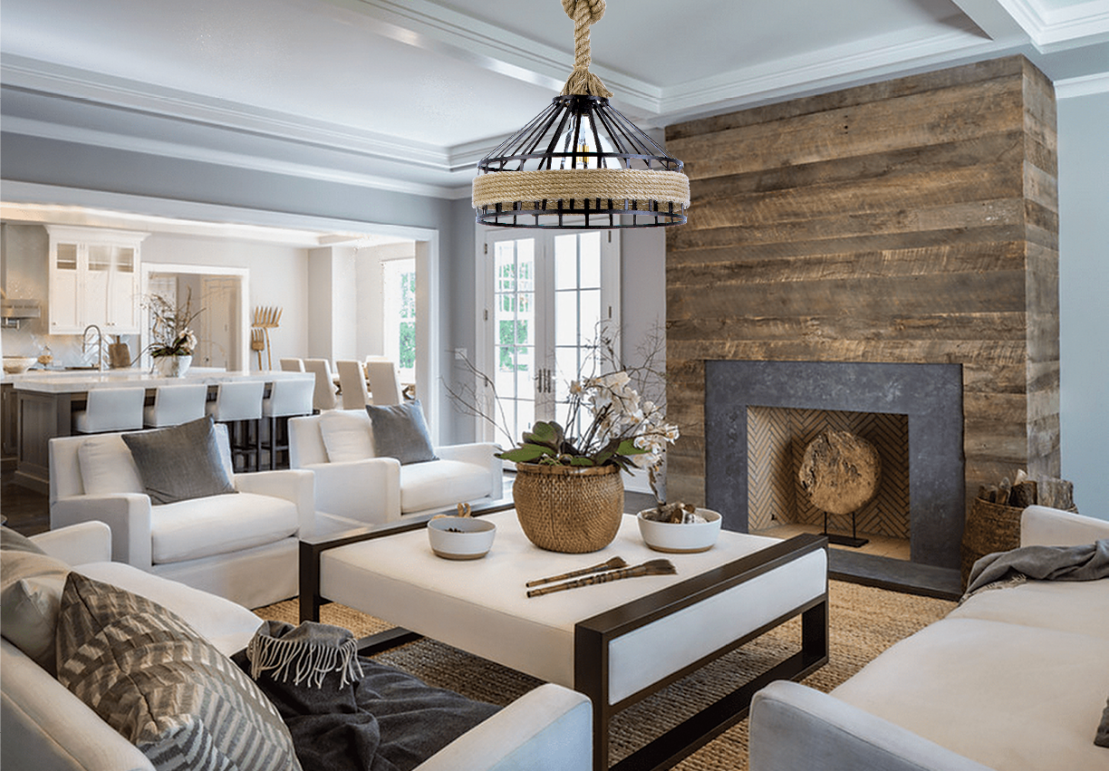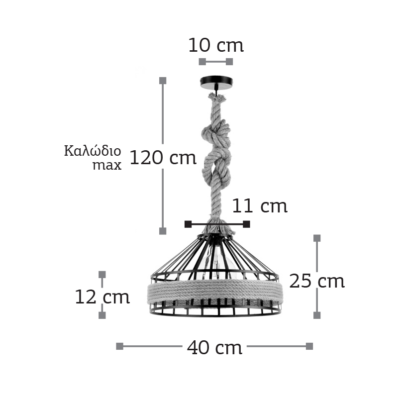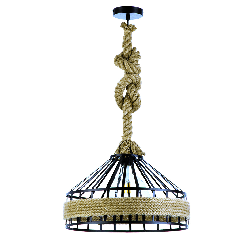 Ένα κρεμαστό φωτιστικό κατασκευασμένο από καφέ σχοινί κατάλληλο για ποικίλους εσωτερικούς χώρους. Είναι σχεδιασμένο με τέτοιο τρόπο ώστε να επιτρέπει στο φως να διαχέεται στον χώρο. Το μαύρο μέταλλο προσδίδει ένα ιδιαίτερο design. Η ανάρτηση προσαρμόζεται στο ύψος του κάθε χώρου.