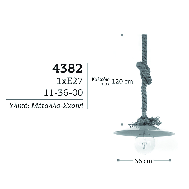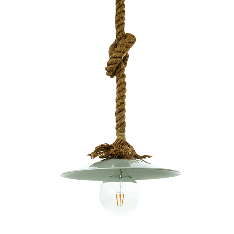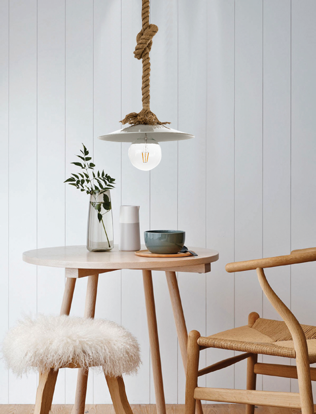 Πρόκειται για ένα κρεμαστό φωτιστικό με συνδυασμό καφέ σχοινιού και λευκού μετάλλου. Η ανάρτηση από σχοινί μπορεί να ρυθμιστεί για να προσαρμοστεί στον κάθε χώρο.