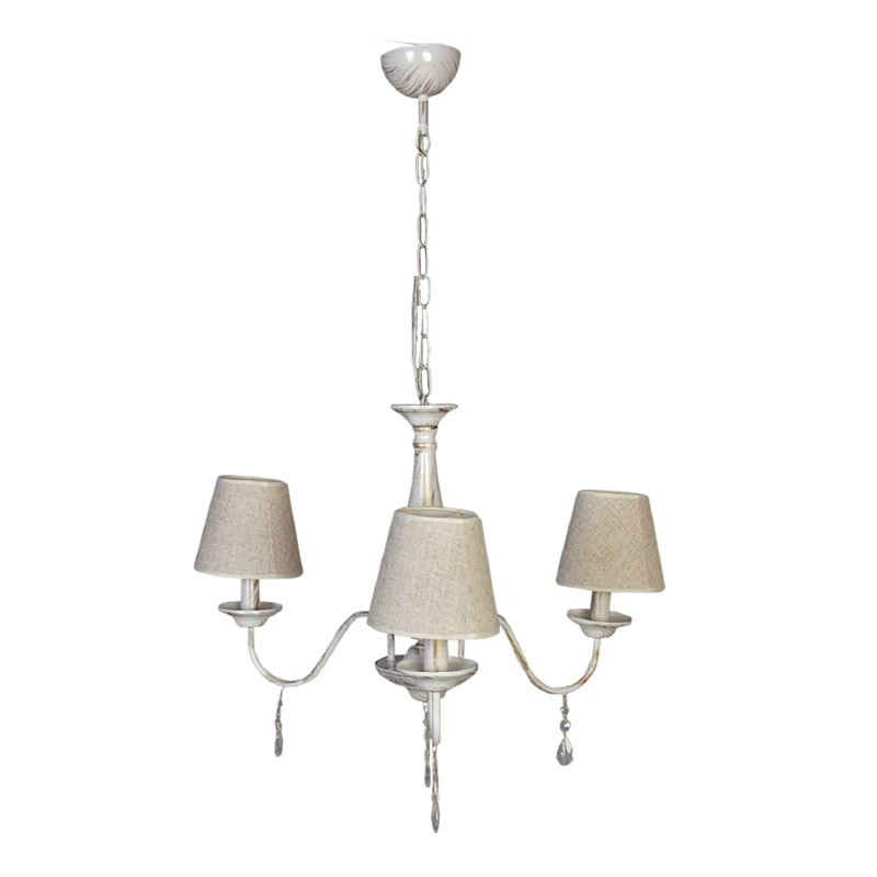 Πρόκειται για ένα μεταλλικό κρεμαστό φωτιστικό σε απόχρωση λευκής πατίνας με τρεις λαμπτήρες. Τα κρύσταλλα δίνουν μια επιπλέον λάμψη, αλλά μπορούν και να αφαιρεθούν. Το υφασμάτινο καπέλο δίνει μια ρομαντική ατμόσφαιρα. Η μεταλλική ανάρτηση είναι ρυθμιζόμενη για να προσαρμοστεί στον κάθε χώρο.