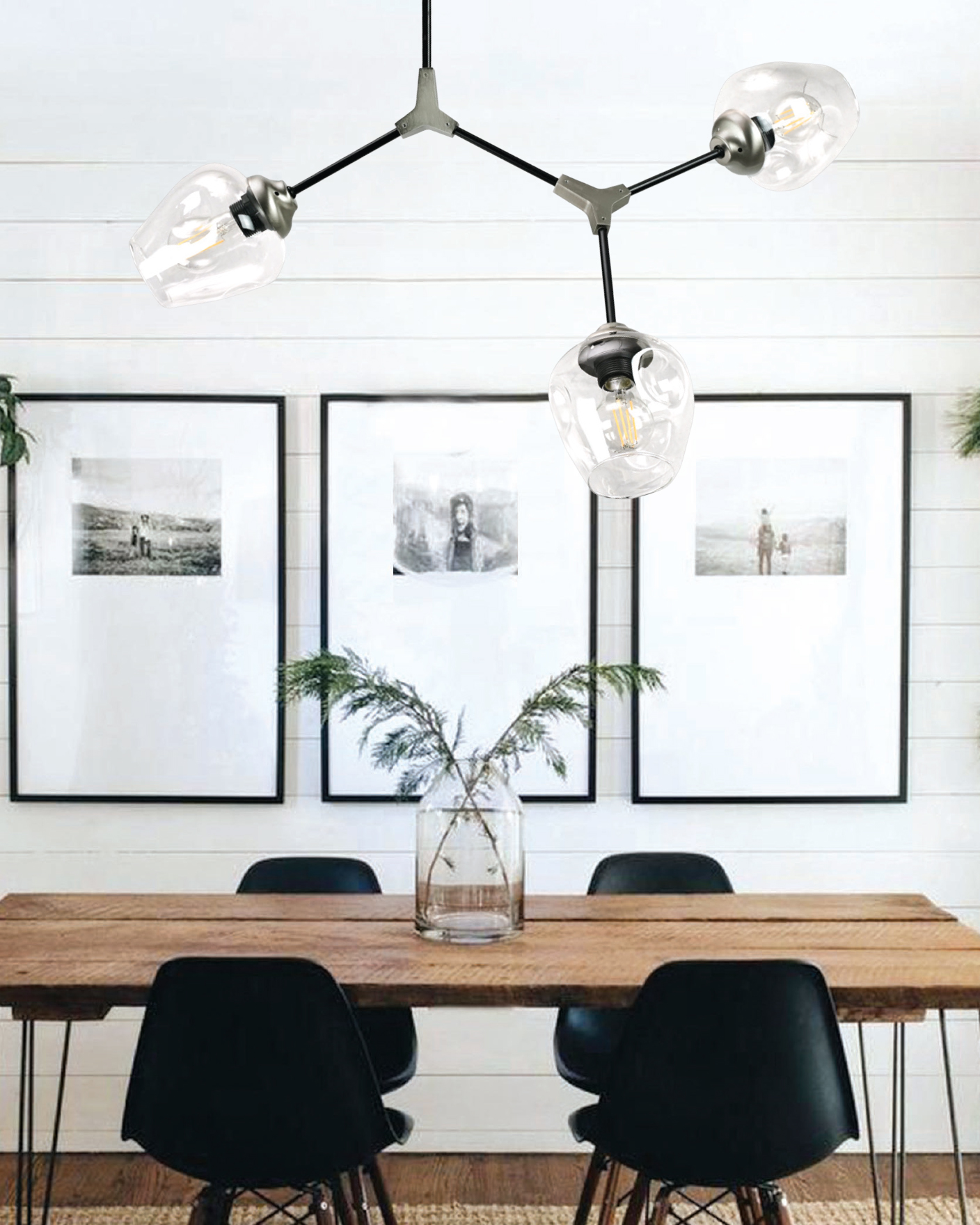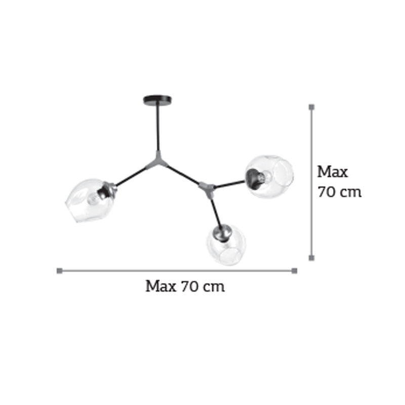 Πρόκειται για ένα μεταλλικό κρεμαστό φωτιστικό μαύρου χρώματος με χρυσαφί διακριτικά στοιχεία και τρεις λαμπτήρες. Το γυαλί είναι διάφανο, αλλά υπάρχει και η επιλογή του φιμέ χρώματος. Ο βραχίονας με τους δύο λαμπτήρες κινείται για να λάβει το επιθυμητό σχήμα. Η μίνιμαλ σχεδίασή του το τοποθετεί σε οποιονδήποτε μοντέρνο εσωτερικό χώρο.