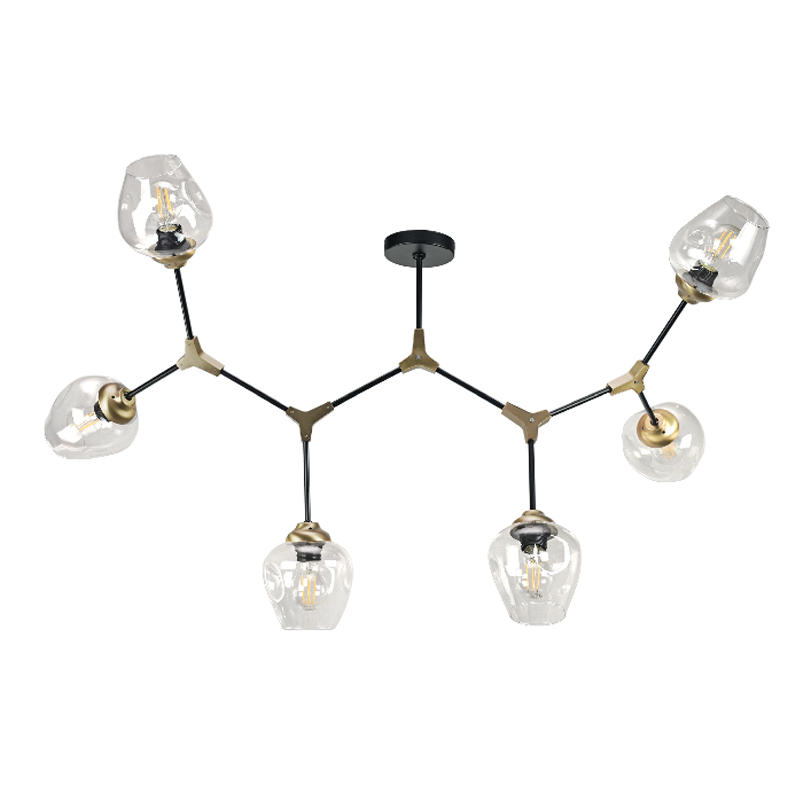 Πρόκειται για ένα μεταλλικό κρεμαστό φωτιστικό μαύρου χρώματος με χρυσαφί διακριτικά στοιχεία και έξι λαμπτήρες. Το γυαλί είναι διάφανο, αλλά υπάρχει και η επιλογή του φιμέ χρώματος. Οι βραχίονες κινούνται για να λάβουν το επιθυμητό σχήμα. Η μίνιμαλ σχεδίασή του το τοποθετεί σε οποιονδήποτε μοντέρνο εσωτερικό χώρο.