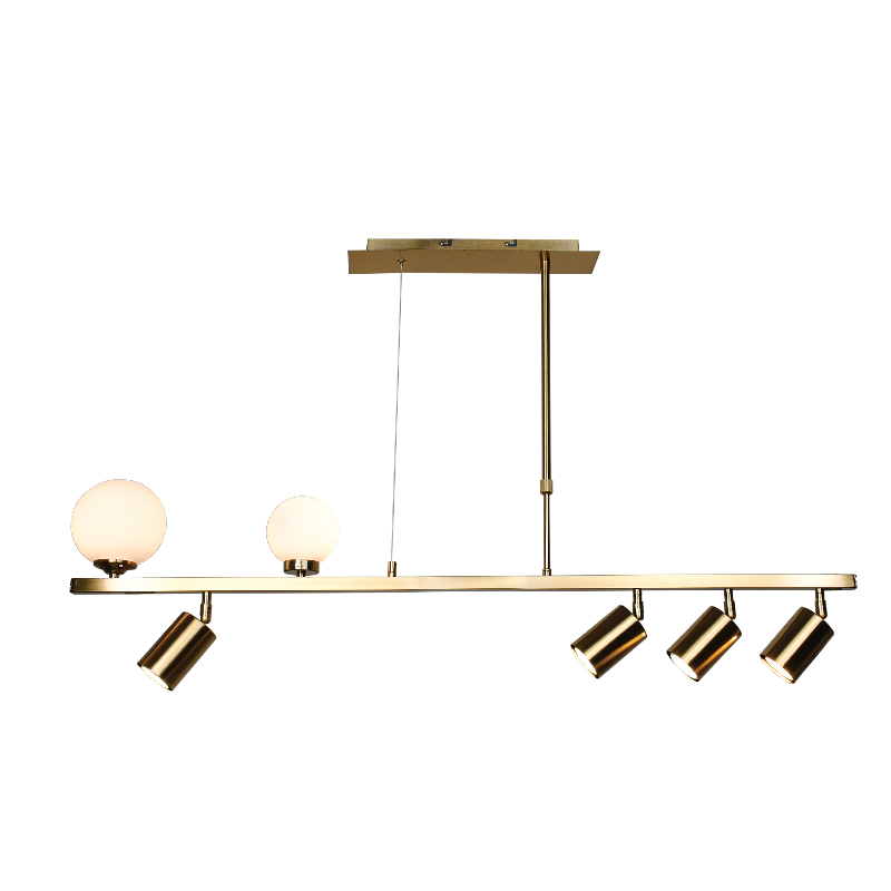 Πρόκειται για ένα κρεμαστό χρυσαφί μεταλλικό φωτιστικό. Ο φωτισμός του είναι συνδυαστικός, αποτελούμενος από δύο λαμπτήρες διάχυσης καλυπτόμενους από λευκή οπαλίνα και τέσσερις λαμπτήρες πιο εστιακούς καλυπτόμενους από μεταλλικό καπάκι. Η ανάρτηση είναι ρυθμιζόμενη ώστε να προσαρμοστεί στον χώρο τοποθέτησής του.